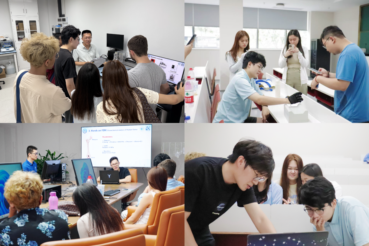 To bring theory to practice, the organizers integrated laboratory resources and tailored five hands-on courses for participants. In the practical course on 3D printing of biomaterials, Dr. Wu Zebin provided participants with typical 3D printing applications in biomedical engineering. In the course on finite element modeling of bioengineering, Associate Professor Yan Chenxi and Dr. Liu Jinglong guided participants to complete biomechanical simulation analysis. In the course on wearable electroacupuncture devices, Associate Professor Li Murong led participants to explore how traditional medicine can be integrated with modern sensing technology. In the course on rehabilitation gloves, Dr. Zhu Zhengyang explained the clinical adaptability of rehabilitation gloves from the perspective of human-computer interaction. In the course on musculoskeletal biomechanics, Dr. Kassim Abdullah used vehicle-safety application cases to discuss the logic of translating basic theory into industrial practice.
